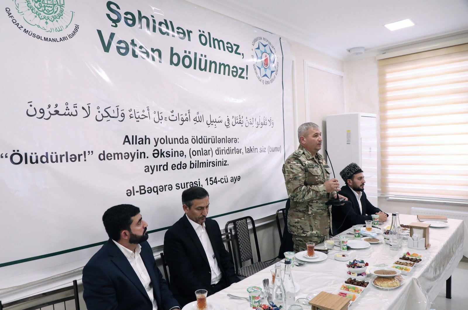 Tədbirdə çıxış edən Rayon İcra Hakimiyyətinin başçısı Adil Əliyev, Dini Qurumlarla İş Üzrə Dövlət Komitəsinin Bakı regional bölməsinin müdiri vəzifəsini icra edən Anar Kazımov torpaqlarımızın ərazi bütövlüyü uğrunda gedən döyüşlərdə şəhidlik zirvəsinə yüksələn qəhrəman oğullarımızın göstərdiyi şücaət nümunələrindən danışıblar.