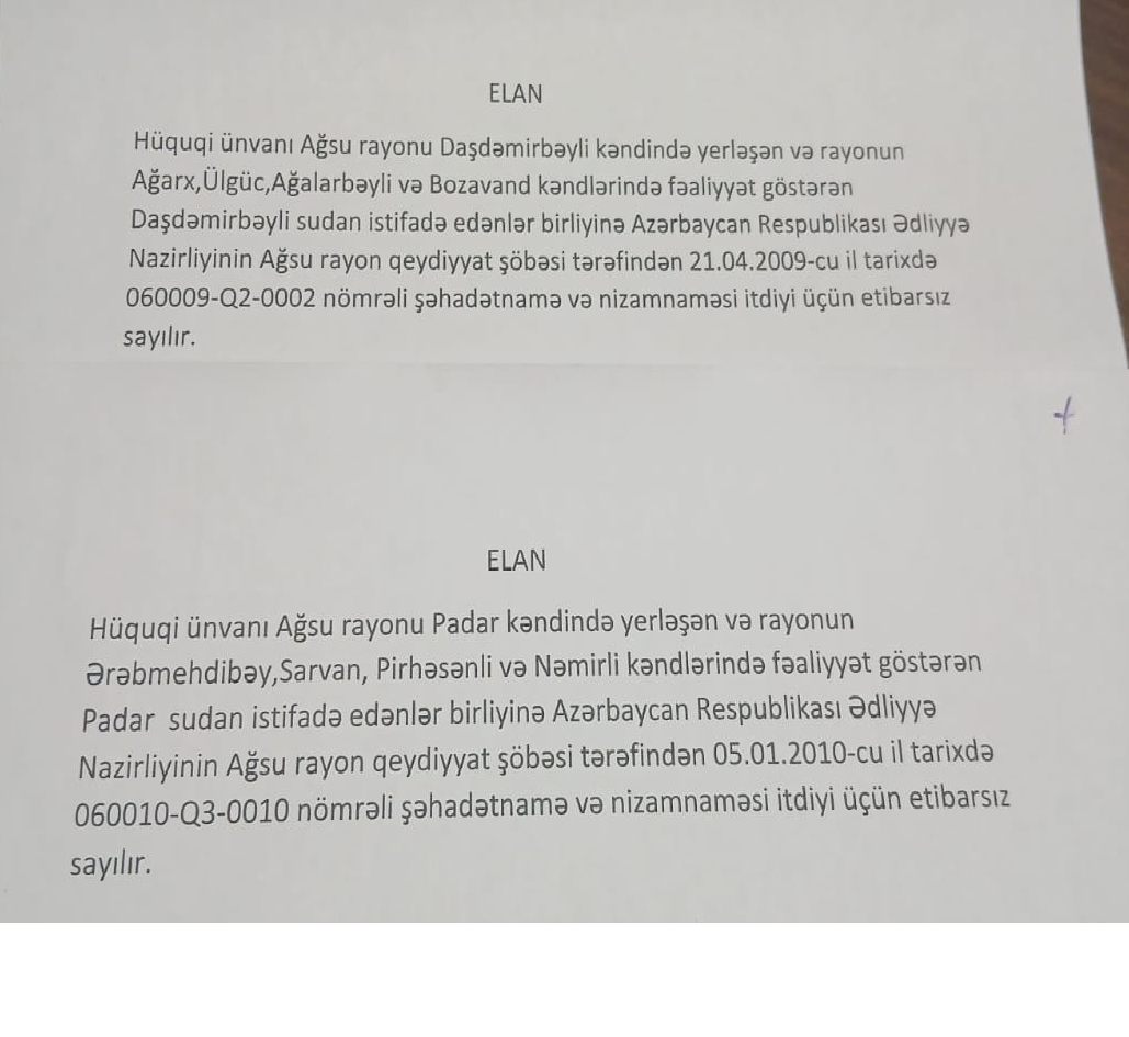 ELANHüquqi ünvanı Ağsu rayonu Daşdəmirbəyli kəndində yerləşən və rayonun Ağarx,Ülgüc,Ağalabəyli və Bozavand kəndlərində fəaliyyət göstərən Daşdəmirbəyli sudan istifadə edənlər birliyinə Azərbaycan Respublikası Ədliyyə Nazirliyinin Ağsu rayon qeydiyyat şöbəsi tərəfindən 21.04.2009-cu il tarixdə 060009-Q2-0002 nömrəli şəhadətnamə və nizamnaməsi itdiyi üçün etibarsız sayılır.